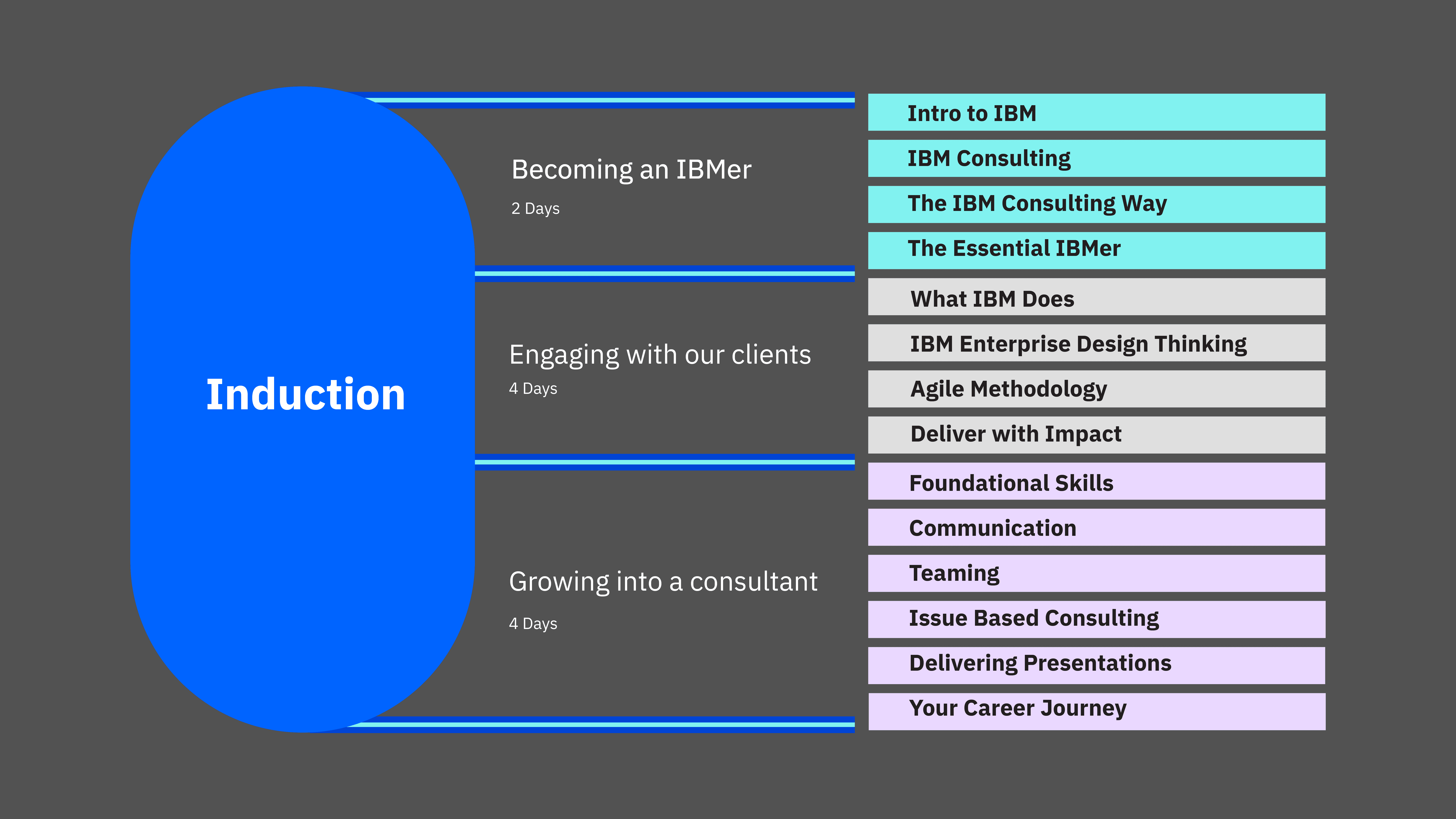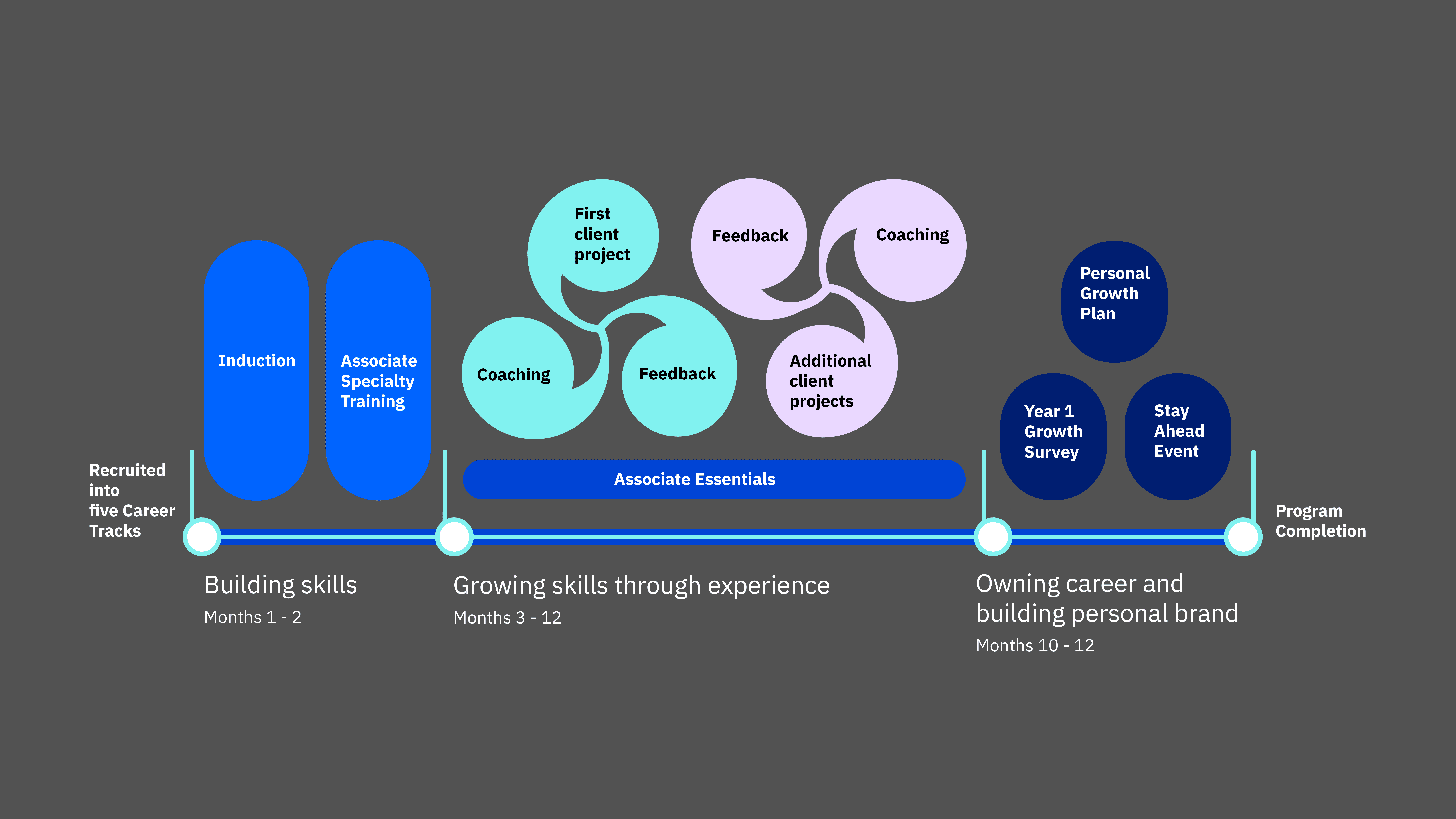 The Associate Experience systematically balances foundational onboarding, career track, practice and specialized technical training to help build a better, more consistent foundation. The Associate Experience spans the first year as an IBMer.